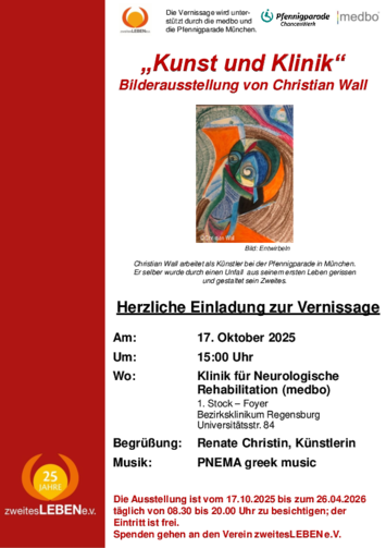 Die Ausstellungsreihe „Kunst und Klinik“ -zweitesLEBEN präsentiert eine farbenprächtige Ausstellung des Künstlers Christian Wall. Die Bilder ziehen den Betrachter durch Formen und Farben in den Bann. Christian Wall arbeitet als Künstler bei der Pfennigparade in München. Er selber wurde durch einen Unfall aus seinem ersten Leben gerissen und gestaltet sein Zweites.